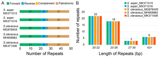 Repeat numbers per repeat type and repeat length of five chloroplast genomes of two Sonchus species. (A) Variation in the distribution of forward, reverse, complement, and palindromic repeats in each chloroplast genomes of five weedy Sonchus genomes. (B) Number of different repeat lengths of each weedy Sonchus chloroplast genomes.