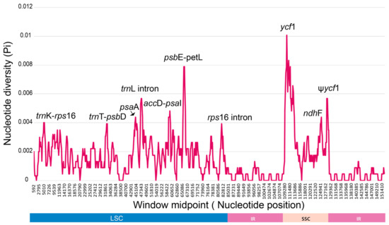 DNA sequence polymorphisms of three Sonchus chloroplast genomes (S. webbii, S. asper, and S. oleraceus) calculated using a sliding window analysis of 1000 bases and 200 base step sizes using DNAsp. Ten most divergent regions are suggested as mutation hotspots and potential chloroplast markers for Sonchus species.