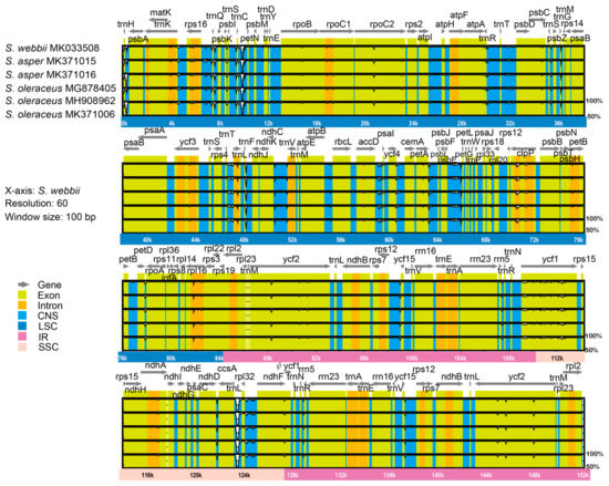 Comparison of five chloroplast genomes of two weedy Sonchus species, S. asper and S. oleraceus plotted against S. webbii by mVISTA. Sequence identity is portrayed with a cut-off of 50% identity. The Y-scale axis represents the percent identity within 50%–100%. Grey arrows indicate genes with their orientation and position. Genome regions are color-coded as green blocks for the conserved coding genes (exon), aqua blue blocks for the conserved non-coding sequences in intergenic regions (CNS), and orange blocks for introns. Thick lines below the alignment indicate the quadripartite regions of genomes; the LSC region is in dark blue, IR regions are in pink, and the SSC region is in peach. Black bordered white peaks that are shown in genome regions indicate the divergent regions with sequence variation among Sonchus species.