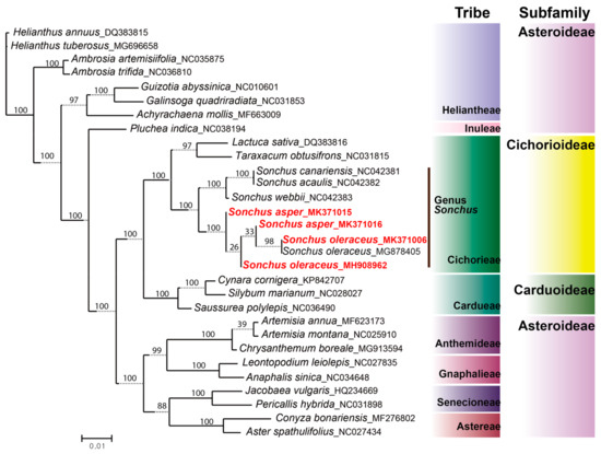Phylogenetic position and relationships of weedy Sonchus sow thistles among Asteraceae species based on whole chloroplast genome sequences inferred from maximum likelihood analysis by IQ-TREE. Numbers above nodes are bootstrap values with 1000 replicates. Newly sequenced four chloroplast genomes representing S. asper and S. oleraceus in this study are red colored on the phylogenetic tree.
