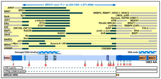 The BRCA1 protein dates to an early period in the evolution of life [55] and shows a remarkable variety of roles and subcellular localization. As reviewed in [56,57], it is primarily localized in the nucleus, where it functions in maintaining genomic integrity (DNA damage signaling, homologous recombination (HR), homology-directed repair (HDR), and oxidative stress regulation), replication, protein ubiquitination, checkpoint regulation, transcription and chromatin remodeling. It also functions in the cytoplasm, in centrosome regulation, apoptosis and selective autophagy (virophagy and mitophagy). It is found in mitochondria, as well [58]. The joint role of BRCA1 and BRCA2 in HR is thought to explain their common disease phenotype [55], but BRCA1 also has tumor-suppressive effects through other functions (reviewed in [56,57]). It shows sequence-nonspecific (damaged) DNA binding [59,60,61,62] and has many protein partners. Figure 1 (collecting information from reviews [53,57,63,64] and references therein, plus [60,61,62,65,66,67,68,69,70,71]) attempts to give an idea of the switches and plug-ins on the BRCA1 protein that could be specific to a given isoform, highlighting attributes relevant to exon 11. The properties rely inter alia on protein conformation, and are thus not directly predictable from the illustration; as an example, BRCA1-IRIS contains the RING domain but, unlike full-length BRCA1, it seems unable to bind to BARD1 [44]. Likewise, the loss of some properties may be bypassed, as is shown by the ability of Δ11q and Δ11 isoforms to enter the nucleus without any nuclear localization signal (NLS), via binding to BARD1 [72] or Ubc9 [73].