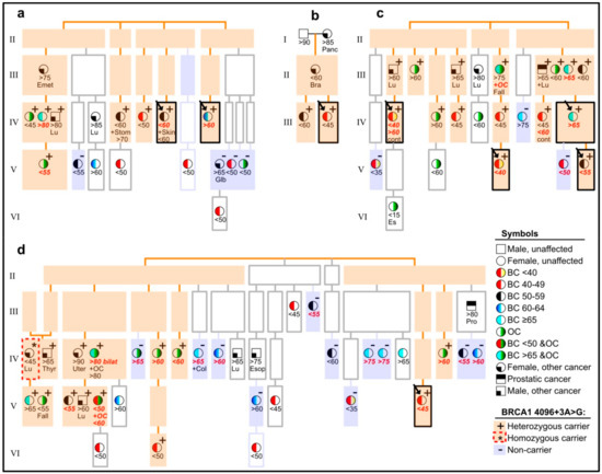 Pedigrees (a–d) of eight probands (arrows in boxes with black borders), showing cancer-affected individuals and their carrier status, with regard to the BRCA1 c.4096+3A>G variant, but withholding details on other pedigree members and exact pedigree structures, in order to avoid recognition. Light orange background is used to highlight segregation of the variant, and light violet background highlights cancer-affected non-carriers. Individuals with a white background were not available for genotyping. See explanation of symbols in the lower right corner of the figure (BC = breast cancer, OC = ovarian cancer). Information about approximate age (in years) at diagnosis of cancer is shown below symbols, in accordance with the symbol’s indication of cancer type, plus further details, in case of contralateral breast cancer (cont), fallopian tubes (Fall), endodermal sinus (Es) or cancers other than BC or OC (Bra for brain, Col for colorectal, Emet for endometrial, Esop for esophageal, Glb for gallbladder, Lu for lung, Pro for prostatic, Stom for stomach, Thyr for thyroid, Uter for uterine). Letters in bold red italic denote that the tumor in question was included in analyses of LOH (loss of heterozygosity) and/or histology.