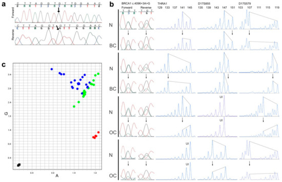 Genotyping and LOH results. (a) Sanger sequencing (forward and reverse electropherograms) of the BRCA1 c.4096+3A>G locus in a homozygous carrier (see Figure 2d, far left in generation IV), the variant signal is indicated by an arrow; (b) Examples of pairs of normal (N) and breast (BC) or ovarian cancer tissue (OC) from the same individual, compared for possible loss of heterozygosity in tumor tissue (arrows pointing to altered signal heights in tumors), as analyzed by Sanger sequencing of the BRCA1 c.4096+3A>G locus (left part, both forward and reverse electropherograms shown) and by PCR-fragment analyses of three microsatellite markers within and flanking the BRCA1 gene (THRA1, D17S855 and D17S579, with allele sizes in base pairs shown on the top, and UI denoting homozygous genotypes, which were uninformative about LOH); (c) An allelic discrimination plot from a BRCA1 c.4096+3A>G SNP assay of 21 NT-pairs (pairs of matched normal- and tumor-tissue-derived DNA from the same individual) from individuals who were heterozygous for the BRCA1 c.4096+3A>G variant. Instead of conventional automatic coloring of genotypes provided by the manufacturer’s software, the dots in this graph were manually colored green if they derived from normal tissue and blue if they derived from tumor tissue. Five samples from non-carriers (homozygous for the A-allele) are shown in red, and two negative controls (water) in black.