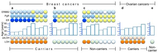 Genetic predisposition to cancer is most often polygenic with no suggestive family history [1], but sometimes it is hereditary, due to a highly penetrant rare mutation, and this is frequently reflected by a prominent family history of the cancer type and an early age of onset [2]. BRCA1 (MIM# 113705) is one of two large genes (BRCA1 and BRCA2) most frequently mutated in families with hereditary breast and ovarian cancer syndrome (HBOC) [3,4,5]. In female carriers of a pathogenic BRCA1 mutation, the average cumulative cancer risk by age 70 is 66% for breast cancer (BC) and 41% for ovarian cancer (OC) [6]. The ratio of OC to BC is associated with the location of the mutation in the gene, and is highest within its central "ovarian cancer cluster" region (OCCR), approximately corresponding to exon 11 [7]. Other genetic and lifestyle/hormonal factors also modify these risks for mutation carriers, exemplified genetically by 26 single nucleotide polymorphisms (SNPs) associated with BC risk, and 11 with OC risk [8]. High-risk kindreds with a BRCA1 mutation may reflect the accumulation of such modifiers, and tested non-carriers in these families may, therefore, or for other reasons, be at elevated risk, or already be affected (known as phenocopies) [9,10]. In many ways, the BRCA2 gene/mutations can be described similarly, with high tissue-specific risks, and risk-modifying effects of lifestyle/hormonal factors, SNPs and three OCCRs in the gene [6,7,8,9,10]. Importantly for the scope of this article, BRCA1 and BRCA2 are tumor-suppressor genes and, in accordance with Knudson’s two-hit model [11], the genotypes in tumors from mutation carriers typically show loss of heterozygosity (LOH), with preferential loss of the non-mutated or "wild-type" copy (wtLOH) of the gene, and its surrounding chromosomal region [12,13]. BRCA1-mutated breast tumors also show a tendency to be pathologically distinguished from other breast tumors with regard to expression of estrogen receptors (ER), as the majority of breast tumors in BRCA1 carriers are ER-negative, while only about 20–30% of other breast tumors (including BRCA2-mutated) are ER-negative [14,15]. For BRCA1 carriers, however, a later age of onset of BC attenuates the BRCA1-characteristic prevalence of ER-negativity [15,16,17].