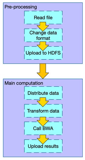 - In the main computation stage: (1) Distribute data from HDFS to different nodes. (2) Transform the data into the original format, so that the BWA-MEM program can process it. (3) Call BWA-MEM. (4) Upload the results to HDFS.