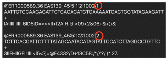 Example of paired-end reads. Four lines compose a read: (1) sequence identifier, (2) raw sequence, (3) optional line, (4) quality score. Paired-end reads share same identifiers, except the last character as showed in red circle in the figure.