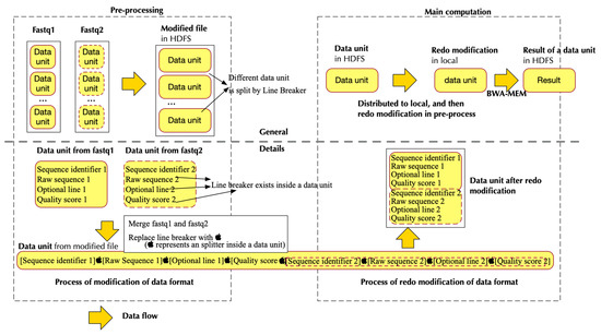 Data flow in PipeMEM in the paired-end situation. The upper part explains the process of PipeMEM with a “data unit” point of view; The lower part explains in detail how data format is modified throughout the PipeMEM process. In the pre-processing, PipeMEM would merge and transform the data unit in fastq files. Then, PipeMEM would upload the modified data unit to HDFS. In the main computation, PipeMEM would distribute the modified data unit to different nodes. PipeMEM would then transform the distributed data unit back to the original format and process them to BWA-MEM. After all of that, PipeMEM would upload the results of that data unit to HDFS again. The below part shows how data format changes in different stages of PipeMEM. In the pre-processing, PipeMEM would replace the line breaker in the data unit by a splitter. Then, PipeMEM would merge the data units in paired-end reads. In the main computation, PipeMEM would replace the splitter inside the modified data unit by line breaker again. After that, PipeMEM would feed this data unit to BWA-MEM.