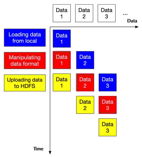 In the pre-processing, there are three tasks: (1) loading data from local disk, (2) altering data format, and (3) uploading data to HDFS. Luckily, loading and uploading belong to I/O (Input/Output) task, which can be handled by DMA (Direct Memory Access). Additionally, uploading data relies on the channel of the network, while loading data depends upon the channel of disk access, which means they are independent of each other. Moreover, modifying the data format is done by CPU. So, three different kinds of hardware can handle these three tasks separately.