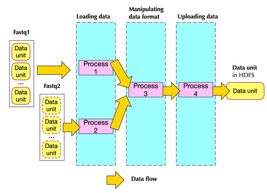 Implementation of the pre-processing stage in the paired-end situation. Process 1 and process 2 are in charge of loading data, each one handling one fastq file. They pass the input data to process 3, which is in charge of manipulating data format. Process 3 passes the result to process 4. Process 4 would upload this data to HDFS.