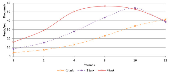 Figure 7 shows the performance comparison of different pairs of task count and thread count. It was easy to see that four tasks with eight threads brought about the highest performance. The following experiments would be conducted under this parameter setting.