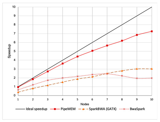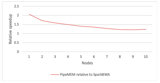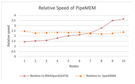 From Figure 10, we could see that PipeMEM was at least 2.2 times faster than SparkBWA and at least 1.5 times faster than BWASpark. The relative performance between PipeMEM and SparkBWA was relatively stable. The relative speedup of PipeMEM to SparkBWA was increasing as the number of nodes increased. It achieved about 2.66× speedup in the 10-node environment. On average, PipeMEM was 2.33 times faster than SparkBWA and 2.27 times faster than BWASpark.