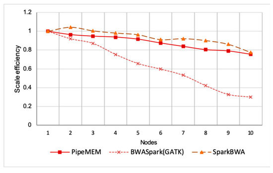 Figure 8 shows the throughput of all tools run through 10 nodes. The ideal line was drawn under the assumption that BWA-MEM could be scaled with the efficiency of one.