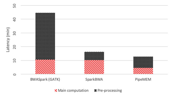 From Figure 11, it is easy to see that the pre-processing of BWASpark was too long compared with the time consumed by its main computation. Though the time consumption of the pre-processing in PipeMEM was higher compared with SparkBWA, the total performance of PipeMEM was still better.