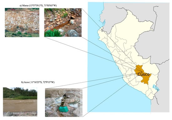 Location of the field sites in Cusco Peru. (a) Maras with 3000 shallow ponds. (b) Acos at the origin of the water.
