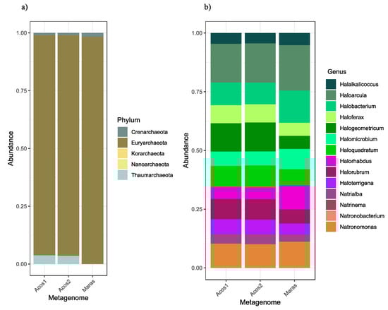 The two samples from Acos exhibited similar compositions of microorganisms: Proteobacteria corresponded to ~59% of identified sequences, followed by Bacteroidetes (11%), Balneolaeota (6%), Firmicutes (5%), and Actinobacteria (2%). Both Acos metagenomes had the same composition as environments of intermediate salinity previously reported, showing a high diversity and abundance of bacteria [7,38]. Interestingly, in Acos salterns members of the Balneolaeota phylum were identified, including moderate halophiles (5–10% NaCl) abundant in sediments, saline soils, and marine habitats [55,56] (Figure 2b,c).