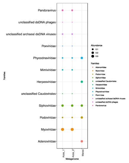 Interestingly, in Maras eukaryotic viruses such as Adenovirus and Herpesvirus were identified, probably as a consequence of the composition of eukaryotic organisms in the samples, as also reported for Red Sea brines [77]. Additional double-stranded DNA (dsDNA) viruses associated with eukaryotes were also found in the Acos samples, mainly viruses from the Phycodnaviridae, Poxviridae, Mimiviridae, and Pandoravidae families (Figure 4); all of these are Megavirales, which are nucleocytoplasmic large DNA virus (NCLDVs). NCLDVs infect animals and unicellular eukaryotes [78] found in other hypersaline environments, such as the Salton Sea in the United States and Organic Lake in the Antarctic [79].