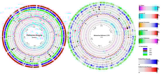 Draft genome comparison of Halomonas elongata and Idiomarine loihiensis. From the outside to center of the genomes of Halomonas elongate-like from Acos 2 (red) and Acos 1 (blue), the innermost rings show percent AT, GC skew, GC content, global inverted repeats, CDS-, CDS+, position preference, stacking energy, and intrinsic curvature, which are colored in a gradient, and the interpretation of the references to color is in the figure legend. The Idiomarine loihiensis-like genome from Acos 2 (green) and Acos 1 (blue) and the innermost rings show the same interpretation of genome H. elongata.