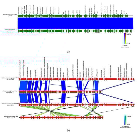 In the Acos samples, two phages of Halomonas elongata were recovered. This finding was somewhat expected, since H. elongata is abundant in these intermediate-salinity environments, but this is the first time that bacteriophages have been reported in this bacterium. The two recovered phages have a size length of approximately 28 Kbp, and a comparative analysis with two ΦHAP-1 reference genomes revealed that they have the same pattern of synteny and a protein identity greater than 65%. (Figure 7b).