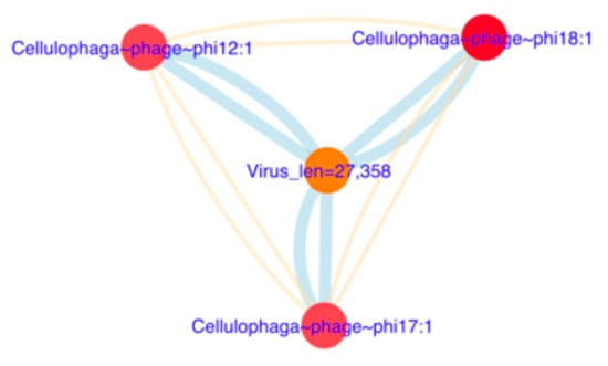Protein-sharing network of genome of Cellulophaga phage. Yellow lines indicate strong similitarity, and blue lines indicate weak similarity. Thus, the virus of length 27,358 bp could be a novel virus.