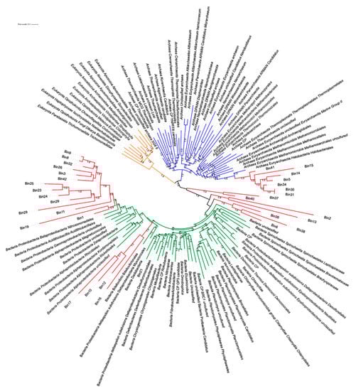Another strategy to retrieve new genomes from metagenomic sequences with little or no identity with sequences already reported is by binning, in which genomes are assembled without a reference sequence. The binning method has the aim to classify contig sequences in a specific taxon, called metagenome-assembled genomes (MAGs). The binning methods can also describe novel species in these environments. The binning of metagenomic sequences was performed only for Acos, because at least two samples with the same origin are necessary to enrich the data. From this, a total of 42 bins were assembled in annotated draft genomes, and their ribosomal genes were extracted. However, some of this process resulted in a low degree of completeness. Therefore, we performed a phylogenetic analysis that revealed that 31 MAGs were classified within a specific domain and seven of them were closely related to the Halobacteria class (Bin 5, Bin 14, Bin 15, Bin 31, Bin 30, Bin 34, and Bin 41) (Figure 9) within the Euryarchaeota phylum, which is predominant in hypersaline environments.