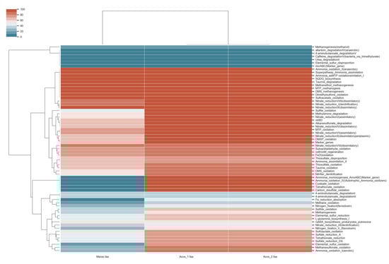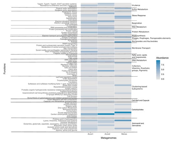 Prodigal v2.6.3 [34] was used for predicting protein-coding genes in the assembled contigs by using the metagenomic mode, and the functional assignment was achieved using SUPERFOCUS [35], which contains the SEED database with an E-value of 10−5. From functional abundance tables, a heatmap using the ggplot2 library [36] and RColorBrewer library in R (www.ColorBrewer.org) was generated. Finally, microbial metabolic pathways involved in the biogeochemical cycles for carbon, sulfur, nitrogen, hydrogen, iron, and oxygen were identified using the Multigenomic Entropy-Based Score pipeline (MEBS v1) with a false-discovery rate of 0.0001 [37].