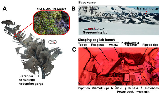 DNA extracted from Hveragil hot spring gorge. (A) 3D render of Hveragil hot spring gorge from a drone flight highlighting the location of sample collection (decimal degree (DD) coordinates: 64.683067, −16.527890). Render completed using footage from a Mavic Pro Drone (DJI, Shenzhen, China) and Pix4Dmapper software (Pix4D, Lausanne, Switzerland). (B) Landscape photograph indicating the location of sample collection “Hveragil gorge” and the base camp where DNA extraction and sequencing took place (“Sequencing lab”). (C) A photograph showing the set up for tent-based DNA extraction in a sleeping bag lab. Items displayed are labelled. Terralyzer for bead beating is omitted from the photograph.