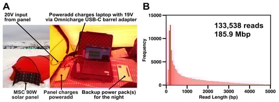 Two off-grid sequencing runs yielded almost 190 Mbp of data. (A) The solar power strategy for powering a laptop running Oxford Nanopore offline MinKNOW software (v18.12.9). Items shown are labelled. (B) Read length distribution for pooled sequencing runs. For simplicity only reads <5000 bp are shown.
