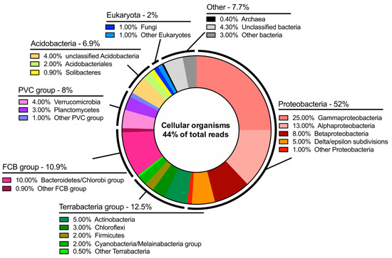 Metagenomic protein-level taxonomic identification from both sequencing runs combined. Kaiju output is shown for 44% of reads that successfully aligned to the NCBI reference database and assigned to “cellular organisms”. The relative percentage of reads assigned to “cellular organisms” of each group of organism is shown. PVC group, superphylam named after three important members Planctomycetes, Verrucomicrobia, and Chlamydiae; FCB group superphylam named after three important members Fibrobacteres, Chlorobi, Bacteroidetes.