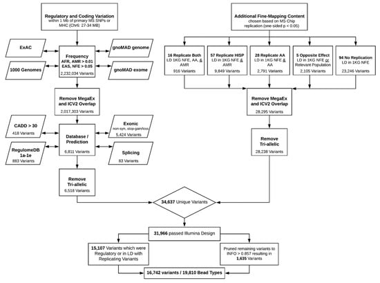 Due to the high costs of next-generation sequencing and the power needed for variant detection, we therefore sought to design a customized array in order to cost-efficiently fine-map these 200 MS risk associations in multi-ethnic populations. The base content of this custom array includes the Ilumina Infinium expanded multi-ethnic genotyping array (MEGAEX) and the Infinium ImmunoArray-24 v2 BeadChip (ImmunoChipV2); to which we have added additional custom content of ~20,000 bead types or ~17,000 variants (Figure 1). The base array content allows for both substantial coverage of many previously identified autoimmune loci, although the ImmunoChipV2 was designed primarily for European populations, in addition to a robust genome-wide platform with great imputation capability. The genome-wide coverage of the MEGAEX rivals that of the larger Illumina Omni 2.5 array, but specifically leverages the identification of novel variation (identified through whole genome sequencing) as a means to more fully capture and tag more moderate-frequency genetic variation within genetically diverse minority populations (i.e., African Americans and Hispanics). The genome-wide coverage may additionally be useful for quality control, ancestry estimation, and additional downstream analyses. The custom content was designed using a two-pronged approach with both the potential presence and absence of allelic and locus heterogeneity in mind.