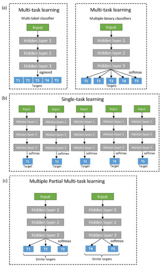 Various deep neural architectures for multi-task and single-task learning: (a) Multi-task learning architectures for two types of target specific output neuron; Multi-label classifier (left) and Multiple binary classifiers (right); (b) Single-task learning; (c) Multiple Partial Multi-task learning which separates targets into multiple partial target sets for training together by multi-task learning.