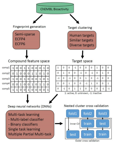 Overall workflow scheme. Compound feature data and target activity data were curated from the ChEMBL database. Various deep neural network architectures including multi-task and single-task learning were trained and tested by nested cluster cross validation.
