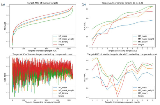 When testing overall human targets without considering similarity, the prediction performance of single-task learning outperformed that of multi-task learning. Surprisingly, target-AUC for the single-task network generally showed better performance across targets (Figure 3a). More than 70% of targets displayed their best performance when trained by single-task learning. However, the low minimum target-AUC for single-task learning remained a defect. The failure of multi-task learning might be caused by insufficient training for the difference between dissimilar targets. As multi-task networks share hidden layers across targets, the difference between targets should be trained by target-specific layers. This result implies the importance of target selection for fine multi-task learning (Table 4).
