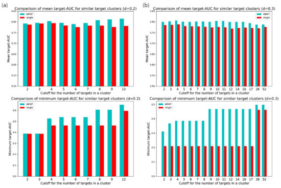 Comparison of target-area under curve (AUC) between multiple partial multi-task learning and single-task learning for similar target clusters. Clusters containing more targets than the cutoff were selected and the target-AUC of the targets in the clusters were evaluated: (a) Comparison of target-AUC for similar targets clustered with a distance of 0.2. The upper bar graph represents the average target-AUC with different cutoffs for the number of targets in a cluster. Below represents the minimum target-AUC within selected clusters; (b) Comparison of target-AUC for similar targets clustered with a distance of 0.3.