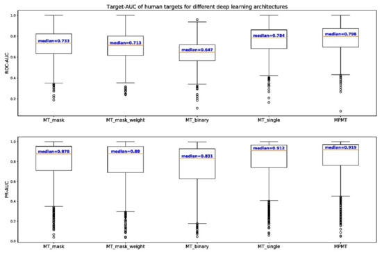 We also compared the performance of MPMT to that of other deep neural architectures for 1067 human targets (Table 6). Human targets were clustered by the distance cutoff of 0.3. Each cluster with at least 2 targets was trained by MT-binary to retrieve the benefits of multi-task learning for as many targets as possible. Targets that did not cluster with any other targets were subjected to single-task learning. MPMT outperforms both multi-task and single-task learning with 65.1% of targets predicted more accurately compared to baseline. To compare the performances for different architectures visually, box plots of target-AUC for human targets were drawn (Figure 5). For not only ROC but also the Precision-Recall (PR) curve, target-AUC for MPMT had the highest median among them all. For the rank-sum test, p-value equals 3.34 × 10−3 for the alternative hypothesis that MPMT shows higher target-AUC compared to single-task learning, and p-values are even smaller when compared to other architectures. This result concludes that the deep learning model that is built by MPMT shows the most reliable binding prediction for human targets.