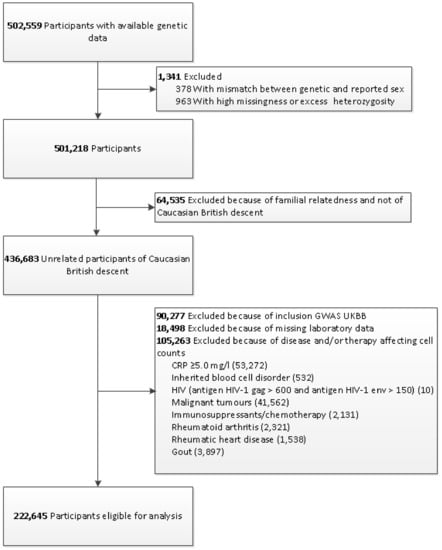 The genotyping process and arrays used in the UK Biobank study have been described elsewhere in more detail []. Briefly, participants were genotyped using the custom UK Biobank lung exome variant evaluation axiom (Affymetrix: Santa Clara, CA, United States; n = 49,949), which includes 807,411 SNPs or the custom UK Biobank axiom array (Affymetrix; n = 452,713), which includes 820,967 SNPs []. The arrays have insertion and deletion markers with more than 95% common content [,]. Imputed genotype data were provided by UK Biobank, based on merged UK10K and 1000 Genomes phase 3 panels []. Figure 1 shows a flowchart of the study sample selection and is further described below. Participants were excluded if there was no genetic data available or if there was a mismatch between genetic and reported sex (n = 378). Furthermore, participants with high missingness or excess heterozygosity were excluded (n = 963). Participants with familial relatedness or who were not of white British descent were excluded as well (n = 64,535). In addition, participants included in the GWAS on physical activity (n = 90,277) [] and participants without lab measurements were excluded (n = 18,498). Lastly, participants with diseases or medication affecting the immune response were excluded as well (n = 105,263). We created a set of 222,645 individuals for the present analyses.
