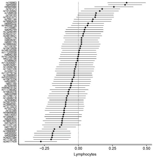 Forest plot of physical activity single nucleotide polymorphisms on lymphocyte levels.