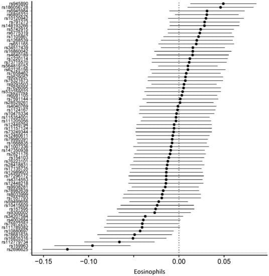 Forest plot of physical activity single nucleotide polymorphisms on eosinophil level.
