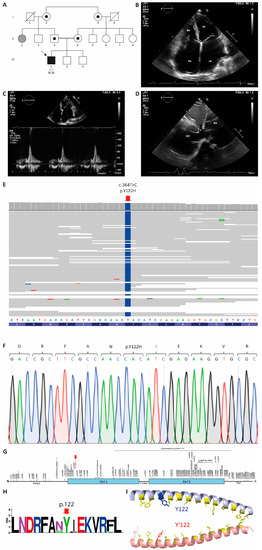 At the age of 19 years, the male index patient (III-1, Figure 1A) received a routine cardiac check-up revealing biatrial enlargement and a right bundle branch block. He had no significant family history of cardiac disease, however, it was known that his parents were second cousins. The patient reported an active lifestyle, both during childhood and at the time of initial contact, participating in various forms of sport activities including weight lifting without cardiac symptoms. Between the ages of 21 and 22 years, he developed recurrent episodes of severe bradycardia due to a third degree atrioventricular (AV) block. In consequence, a permanent pacemaker was implanted. Subsequently, he was referred for an echocardiography to evaluate cardiac function as an underlying cardiomyopathy was suspected. The echocardiography revealed a normal sized left ventricle (LV) with mildly reduced systolic function (LV ejection fraction 45% ± 5%). Severe biatrial enlargement was present, with the left atrium (LA) volume at 166 mL/m2. The LV diastolic filling parameters showed the following: mitral valve (MV) E/A ratio 2.6, MV deceleration time 124 ms, LV E’ septal velocity 0.08 m/s, and LV E’ lateral velocity 0.25 m/s. The right atrial pressure (RAP) was measured at 20.00 mmHg. The LV diastolic filling parameters indicated severely abnormal diastolic filling and relaxation (E/A 2.6). Moreover, an elevated pulmonary artery systolic pressure and a markedly dilated inferior vena cava (IVC) with abnormal flow dynamics suggested right-sided pressure overload. In total, the clinical findings are in good agreement with the diagnosis of RCM in combination with AV conduction disease. A clinical follow-up at the age of 27 years, using echocardiography, confirmed the diagnosis of RCM (Figure 1B–D). The creatine kinase (CK) and B-type natriuretic peptide (NT-proBNP) values were highly increased (CK = 588.3 U/L and NT-proBN = 1240.5 pg/mL) supporting the diagnosis of heart insufficiency. Therefore, we screened III-1 for cardiomyopathy-associated genetic variants using a NGS panel of 174 genes associated with cardiomyopathy, which revealed a homozygous DES mutation, p.Y122H (Figure 1E). Several further nonsynonymous genetic variants were detected (Table S1), which were mainly excluded as pathogenic mutations based on their minor allele frequency (MAF) above 0.01. Sanger sequencing was used for verification of the DES mutation, p.Y122H (Figure 1F). Although no detailed data from the parents are available, further family assessment indicated that only the paternal aunt (II-1, Figure 1A) developed a myopathy without cardiac involvement. Both grandmothers (I-2, 69 years and I-3, 64 years, Figure 1A) are reportedly sisters. Therefore, consanguinity within this family might be a likely explanation for homozygosity of the DES mutation, p.Y122H, found in the genome of III-1. Unfortunately, no DNA samples of other family members were available for genetic analyses. The DES mutation, p.Y122H, affects an amino acid at the beginning of coil 1, which is a hotspot for cardiomyopathy-associated mutations (Figure 1G). This tyrosine is highly conserved between several species (Figure 1H and Figure S1) and is part of the heptade sequence (d-position), which is highly important for the coiled-coil formation of desmin dimers (Figure 1I). In addition, several different bioinformatics prediction tools [27,28] indicate the deleterious impact of the DES mutation, p.Y122H (Table 1).