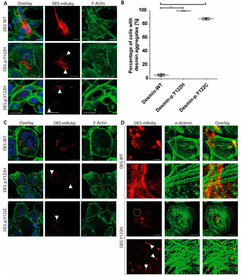 (A) Representative confocal microscopy images of transfected HT-1080 cells. The fluorescence intensity of wildtype and mutant desmin mRuby is shown in red. The fluorescence intensity of Alexa-488 conjugated to phalloidin (for F-actin staining) is shown in green and the nuclei were stained using DAPI (blue). (B) The statistical analysis of desmin aggregate formation revealed for both mutations (p.Y122H and p.Y122C) a severe aggregate formation in the majority of transfected HT-1080 cells. ** p-value < 0.01. (C) Representative confocal microscopy images of transfected SW13 cells. (D) Confocal microscopy of transfected iPSC-derived cardiomyocytes. The fluorescence intensity of wildtype and mutant desmin mRuby is shown in red. Alpha-actinin, as a cardiomyocytes marker, was stained using primary and secondary antibodies conjugated to Alexa488 (green). Scale bars represent 25 µm.
