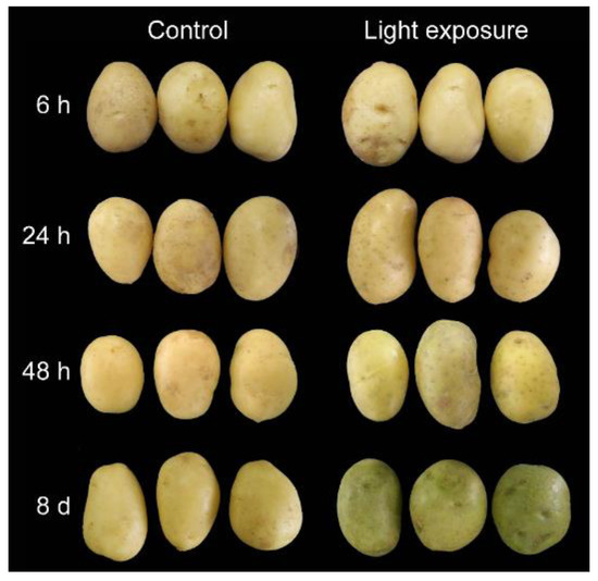 Time-dependent exposure experiments were performed to investigate the change of potato under light. Light exposure followed by phenotypic observation showed that the distinct green color was dependent on the duration of light exposure (Figure 1). A greener color became obvious by the eye when the tubers were exposed to light for 48 h, and when the light exposure reached eight days, the potato skin turned the greenest. Potatoes in the dark had no obvious change in color. Except skin color, no significant difference was found between treated and non-treated tubers.