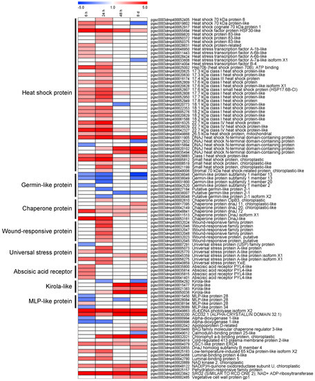 Heat map showed transcriptional profiles of abiotic-related DEGs, which included heat shock proteins, germin-like proteins, chaperone proteins, wound-responsive proteins, universal stress proteins, Abscisic acid receptors, Kirola-like proteins, and MLP-like proteins. Bins in red are significantly up-regulated; bins in blue are significantly down-regulated.