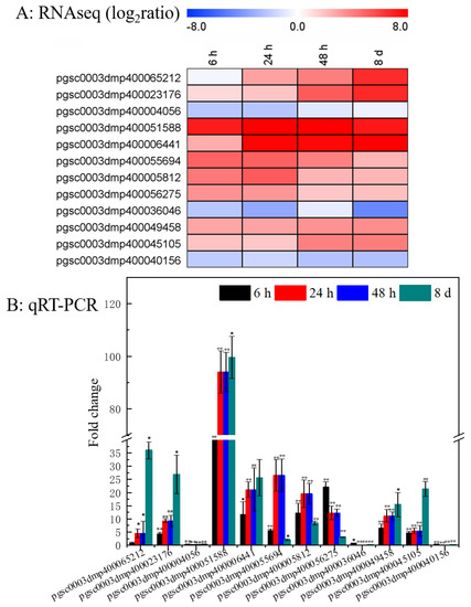 The expression patterns of 12 representative DEGs involved in enriched Bins were confirmed using qRT-PCR assay to verify the reliability of the RNA-seq data (Figure 8B). Three biotic responsive genes encoding PR protein (pgsc0003dmp400065212), late blight resistance protein (pgsc0003dmp400023176), and disease resistance protein (pgsc0003dmp400004056) were checked by qRT-PCR assay. Additionally, two genes that were involved in flavonoid metabolism (pgsc0003dmp400051588 and pgsc0003dmp400006441), five in abiotic stresses (pgsc0003dmp400055694, pgsc0003dmp400005812, pgsc0003dmp400056275, pgsc0003dmp400036046 and pgsc0003dmp400049458), and two receptor-like kinase genes (pgsc0003dmp400045105 and pgsc0003dmp400040156) were also detected. Similar changes in all detected genes were observed between RNA-seq (Figure 8A) and qRT-PCR assays (Figure 8B), as indicated the accuracy of the RNA-seq data.