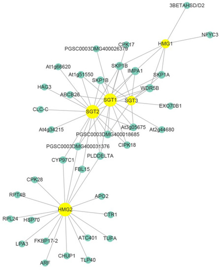 Co-expressional networks of genes responsible for SGA biosynthesis and disease resistance. In the photograph, the SGAs biosynthesis genes were marked in yellow, and the disease resistance genes were marked in green.