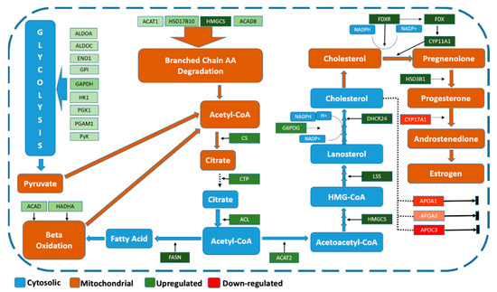Proteins related to steroidogenesis differentially expressed in ovaries of post-pubertal heifers at the luteal phase compared to pre-pubertal Brahman heifers. Green and red tags indicate up- and down-regulated proteins, respectively, and their color intensity is related to the fold change level of proteins. Blue tags indicate literature-reported cytosolic compounds and processes. Brown tags indicate literature-reported mitochondrial compounds and processes. Fructose biphosphate aldolase-A (ALDOA). Fructose biphosphate aldolase-C (ALDOC). Alpha enolase (ENO1). Glycosylphosphatidyle inositol (GPI). Glyceraldehde-3-phosphate dehydrogenase (GAPDH). Hexokinase-1(HK1). Phosphoglycerate Kinase (PGK1). Phosphoglycerate mutase-1 (PGAM1). Pyruvate kinase (PyK). Acyl CoA dehydrogenase (ACAD). Hydroxyacyl-CoA dehydrogenase/3-ketoacyl-CoA thiolase/enoyl-CoA hydratase, alpha subunit (HADHA). Fattyacid synthase (FASN). ATP citrate lyase (ACL). Carboxylic acid transport protein (CTP). Citrate synthase (CS). Acetyle CoA acetyle transferase (ACAT2). Glucose-6-phosphate dehydrogenase (G6PGD). Acetyle CoA acetyle transferase-1 (ACAT1). 3-Hydroactle-CoA dehdrogenase-2 (HSD17B10). Hydromethylglutaryl-CoA synthase (HMGCS). Isobutaryl-CoA dehydrogenase (ACAD8). Lanosterole synthase (LSS). 24-Dehydrocholeaserole reductase (DHCR24). Ferridoxin reductase (FDXR). Ferridoxin (FDX). Cytochrome P450 family 11 subfamily A member 1 (CYP11A1). 3-beta-hdroxysteroid dehydrogenase (HSD3B1). Cytochrome P450 family 17 subfamily A member 1 (CYP17A1). Apolipoprotein-A1 (APOA1). Apolipoprotein-A2 (APOA2). Apolipoprotein-C3 (APOC3).