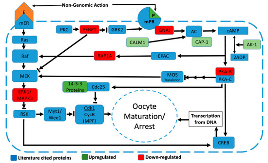Differentially abundant proteins related to oocyte maturation/arrest through progesterone and MAPK signaling in ovaries of post-pubertal heifers at the luteal phase compared to pre-pubertal heifers. Green and red tags indicate up- and down-regulated proteins, respectively, and their color intensity is directly related to the fold change level of proteins. Blue tags indicate literature-reported proteins. Progesterone (P); Estrogen (E); Membrane progesterone receptor (mPR); Adenyl cyclase (AC); Cyclic adenosine monophosphate (cAMP); G-inhibitory protein (GNAI); Calmodulin-1 (CALM1); Adenlyl cyclase associated protein (CAP-1); Adenylate Kinase-1 (AK-1); Protein kinase-A regulatory subunit (PKAR); Protein kinase-A catalytic subunit (PKAC); Exchange factor directly activated by cAMP (EPAC); Ras related protein-1A (RAP1A); Mos protein (Mos); Cel division cycle protein 25 (Cdc25); Protein Kinase-C (PKC); Phosphatidylethanolanim binding protein (PEBP1); Beta adrenergic receptor kinase2 (GRK2); Membrane Estrogn receptor (mER); Mitogen activated protein kinase (MEK); Mitogen activated protein kinase-3 (MAPK3); Ribosomal S6 Kinase (RSK).; Myelin transcription factor-1 (Myt1); Wee1 like protein kinase (Wee1); Cell division kinase-1 (Cdk1).; Cyclin-B (CycB); cAMP responsive element binding protein (CREB).