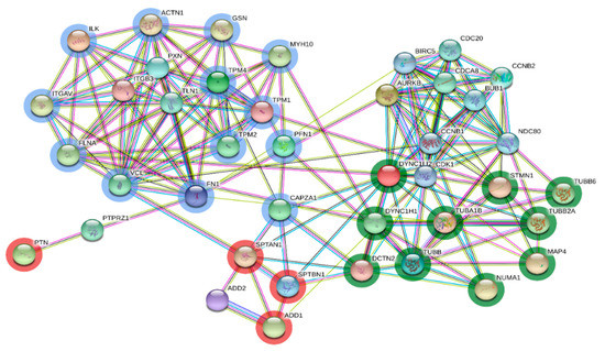 Protein-protein interaction for the subset of differentially abundant proteins involved in pleiotrophin signaling, focal adhesion, and cytoskeleton and microtubule processing under the influence of progesterone signaling. Blue circled nodes indicate proteins which are part of cytoskeleton and focal adhesion. Green circled nodes indicate proteins included in microtubule processing. Red circled nodes indicate proteins interacting with both blue and green nodes. Nomenclature of proteins is given in Table 1.