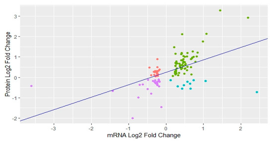 Scatter plot showing correlation between protein abundance and respective gene expression. Green: up-regulated proteins and up-regulated mRNA. Red: up-regulated proteins and down-regulated mRNA. Purple: down-regulated proteins and down-regulated mRNA. Blue: down-regulated proteins and up-regulated mRNA.
