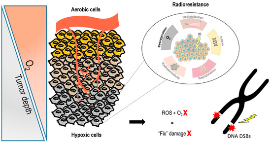 Uncontrolled cell proliferation leads to oxygen demand exceeding oxygen supply. Tumor growth surpasses the capacity of the existing vasculature to provide nutrients and oxygen, leading to hypoxia. The permanent changes in blood flow and oxygen availability resulting from the tumor abnormal vasculature associate with poor prognosis and therapy resistance. In particular, RT that kills tumor cells by generating reactive oxygen species (ROS), has the ability to chemically modify radiation-induced DSB leading to permanent damage fixing [29] (Figure 1).