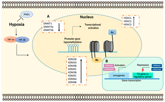 Epigenetic remodeling through hypoxic-dependent pathways. The accumulation of epigenetic alterations is characteristic of a hypoxic microenvironment in tumors. (A) Epigenetic changes. Briefly, is has been intensively reported that after HIF-1α stabilization, decreased DNA methyltransferases (DNMTs) activity correlates with oncogene activation. Conversely, HCADs and KDMs increased activity induces overall genomic instability. (B) Histone modifications. Histone methylation, depending on the residue, induces gene transcription activation or repression. Specifically, H3K4me3 and H3K36me2/3 are often correlated with transcriptional activation, whereas H3K9me3 and H3k27me3 are associated with transcriptional repression, both implicated tumor development and progression. Abbreviations: Ac—acetylation; DNMTs—DNA methyltransferases; HDACs—Histone deacetylases; HIF—Hypoxia-inducible factors; KDMs—Histone lysine demethylases; Me—methylation; PHD—Prolyl hydroxylases; TS—Tumor suppressor.