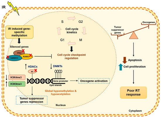 Indeed, decreased global DNA methylation was reported in tumor cells after IR. Moreover, in the course of DNA repair induced IR, polymerases are not able to incorporate methylcytosine during DNA synthesis, but rather cytosine [81]. Thus, a global DNA hypomethylation has been observed after IR and was associated with oncogene transcription activation and consequently carcinogenesis [81].